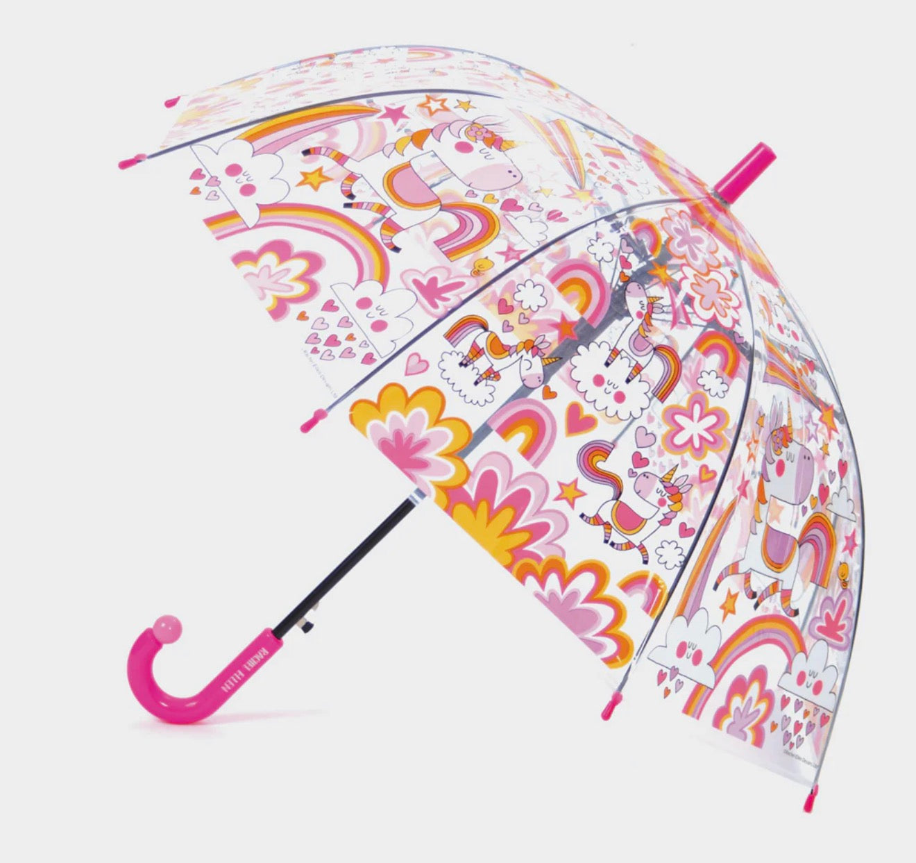 A fun unicorns and rainbows themed umbrella! Kids will love these fun and funky see-through umbrellas, they won’t want to go outside unless it’s raining! Perfect for age 5 and above, they have a black coated metal frame and a 19” auto open dome shape which gives complete coverage of the head and shoulders. Made from an ultra-durable transparent POE material, they are printed with bright colours in 10 beautiful designs with contrasting brightly coloured plastic handles finishing off the look.