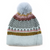 Super soft pale blue bobble hat with multiple patterned knit sections in pink and mustard mix and a faux fur pom-pom