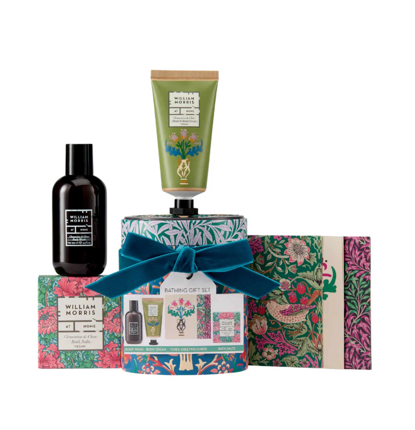 A useful and beauty-filled gift tin for fans of heritage design, finished with teal velvet bow. This round decorative tin with the Flowerpot design contains a cornucopia of treats including hand and body cream, body wash, bath salts and three William Morris print greetings cards.