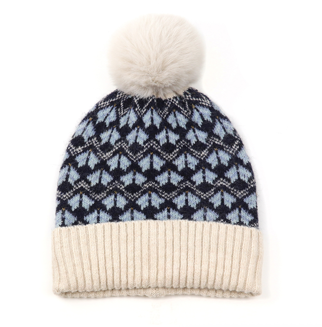 Navy and sky blue recycled blend Scandi flower knit bobble hat with ecru ribbed knit and faux fur pom-pom