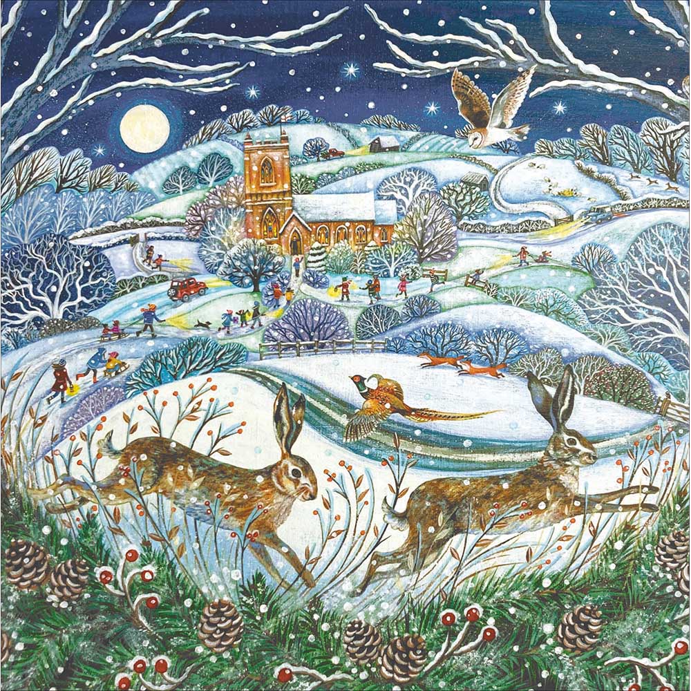 Church Scene With 2 Hares At Front Christmas Card