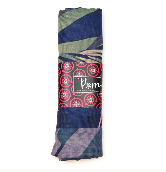 Recycled blend scarf with multiple botanical and abstract print sections in shades of blue, teal and purple