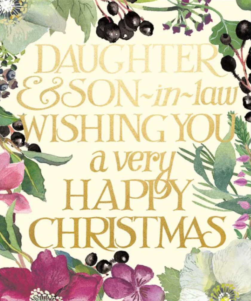 This beautiful Christmas card for a special daughter and son in law is decorated in Emma Bridgewater's inimitable style, with rich pink and white flowers, dark berries and foliage surrounding embossed gold text that reads "Daughter & Son-in-Law wishing you a very Happy Christmas".