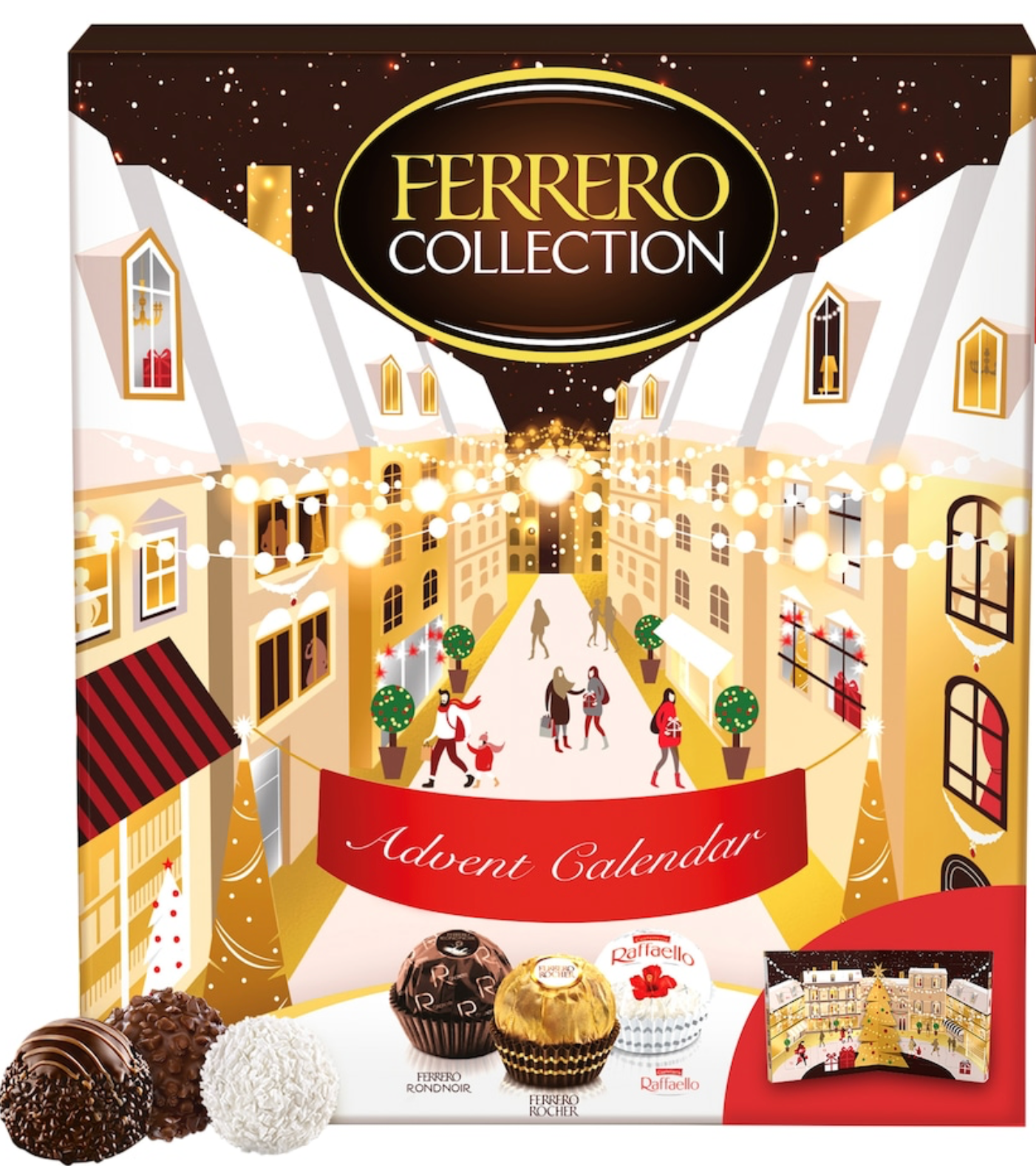 Fine Chocolate Covered Speciality, with a Dark Chocolate Centre in a Smooth Filling Whole Hazelnut in Milk Chocolate and Nut Croquante Crisp Coconut Speciality with Smooth Coconut Filling and a Whole AlmondDiscover the Ferrero Collection Advent Calendar with 24 delicious pralines.A Collection of three Ferrero delicacies: Ferrero Rocher, Raffaello and Rondnoir.Ferrero RondnoirA delicious combination of tastes and textures from fine wafer and rich creamy cocoa filling to a dark chocolate heart.Ferrero RocherA whole hazelnut surrounded by delicious layers of crispy wafer, a creamy filling, smooth milk chocolate and finely chopped hazelnut pieces.Confetteria RaffaelloDelicate layers of wafer, an elegant velvety centre and a toasted almond, all finished with a sprinkling of coconut.Open the Advent Calender and discover more Inside.
