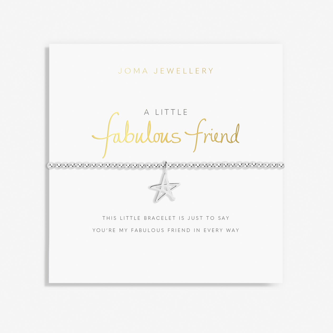 “This little bracelet is just to say you’re my fabulous friend in every way” Utterly fabulous friends are hard to find, so whatever the occasion, spoil them with our thoughtful A Little ‘Fabulous Friend’ Bracelet. This silver-plated stretch bracelet is designed to fit every wrist, holds a sweet star charm that perfectly represents how special your friend is, and sits on a card with the sentiment and poem stamped on it! To ensure the perfect gifting moment, every order comes with a free Personalised Gift Bag, so you can gift pretty every time!
