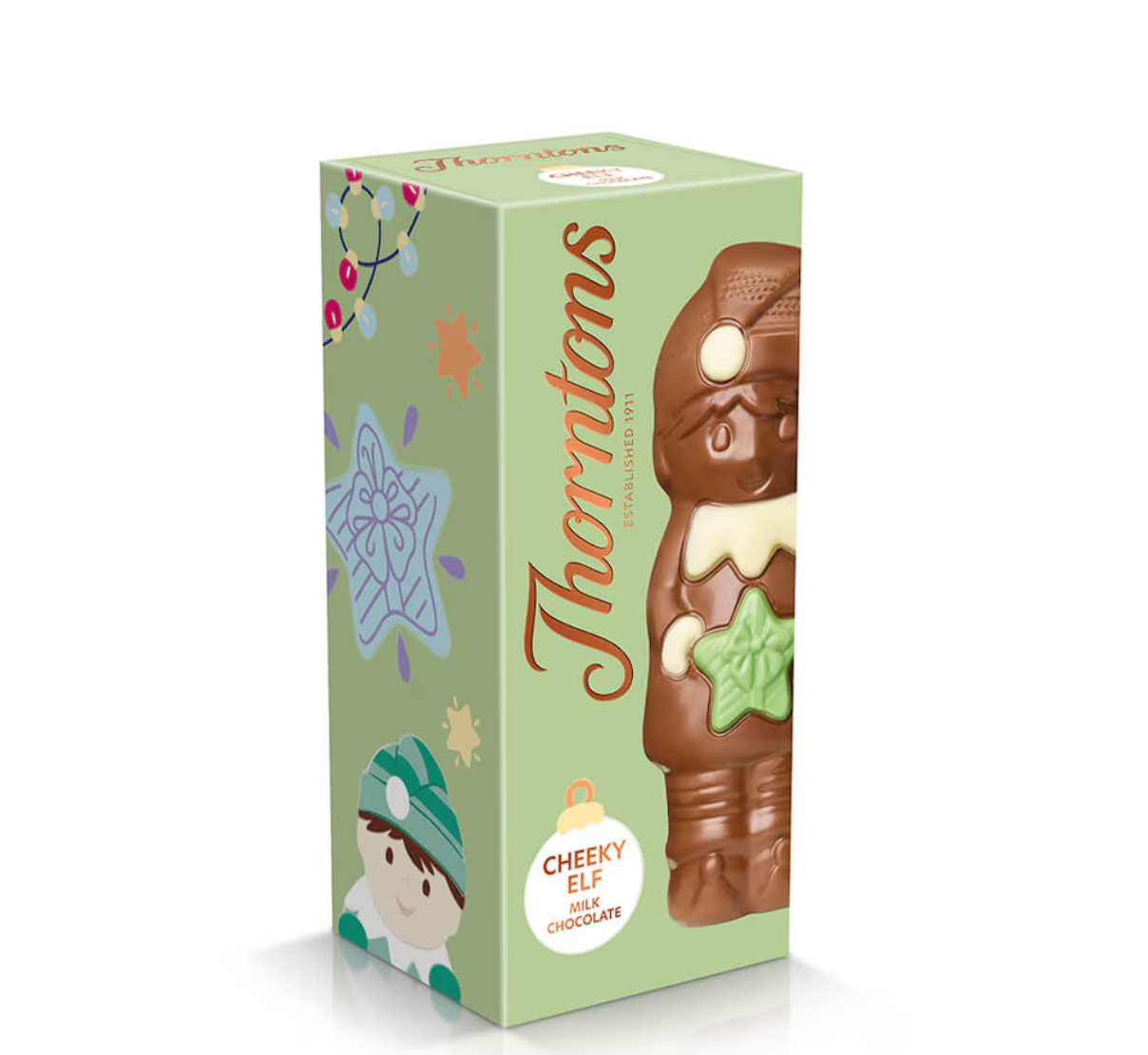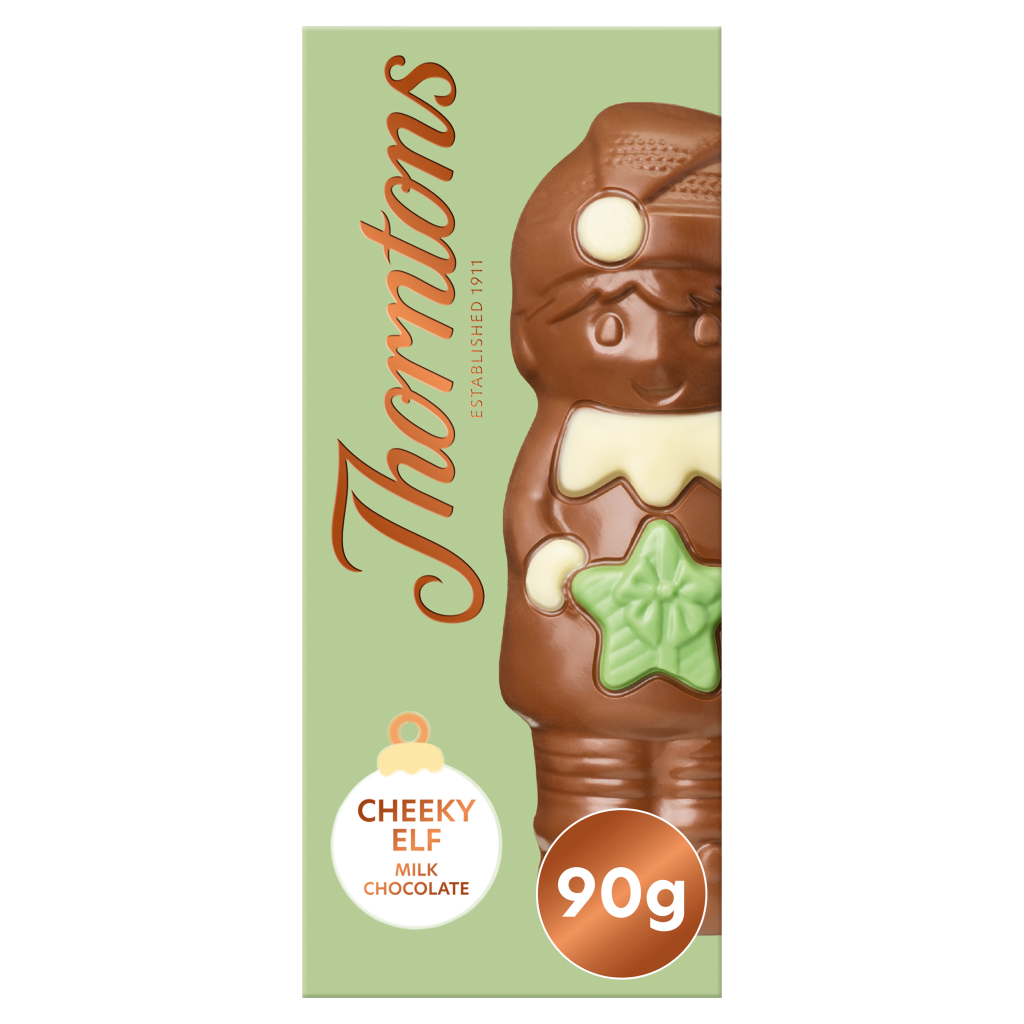 Crafted from delicious milk chocolate and decorated in white and green, our Thorntons Cheeky Elf is 90g of Christmas fun!